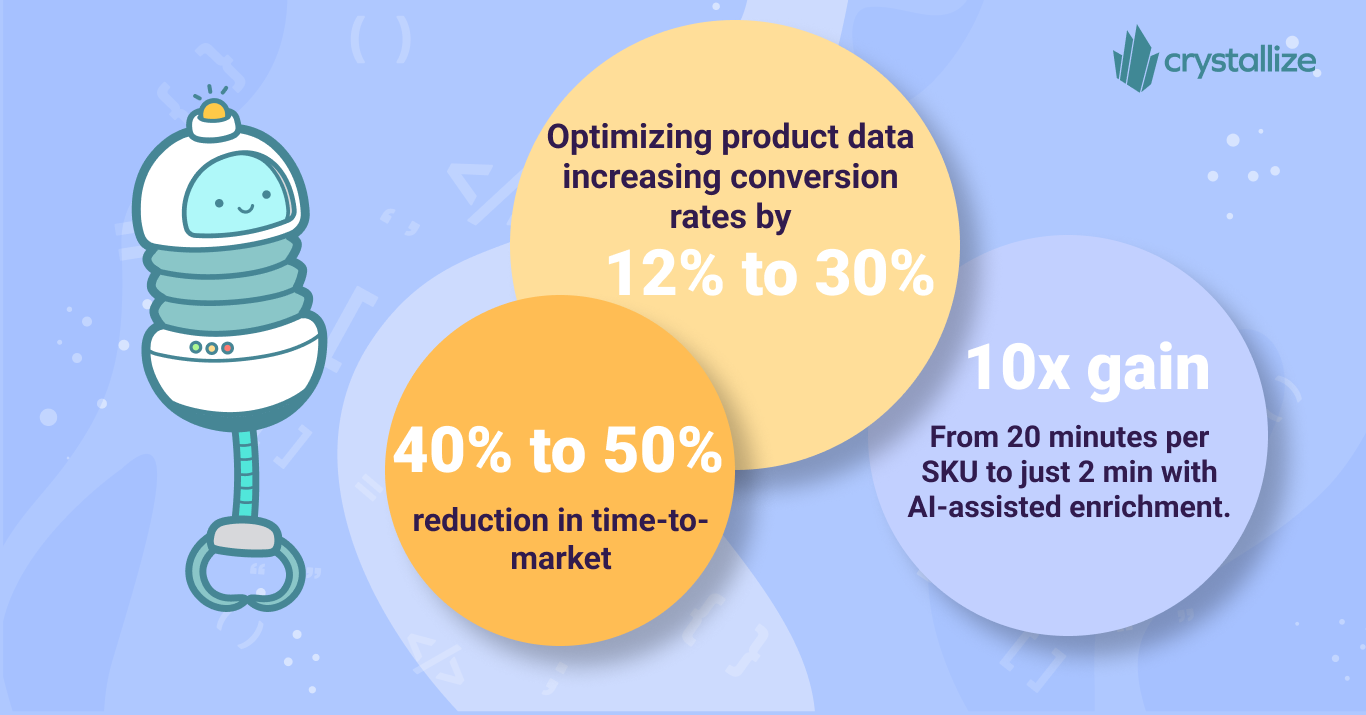 - Routine Task Elimination: AI-assisted data enrichment tools can reduce the time required to prepare product content from 20 minutes per SKU to just 2 minutes. This 10x efficiency gain eliminates 80% to 90% of routine, manual tasks for product data.5