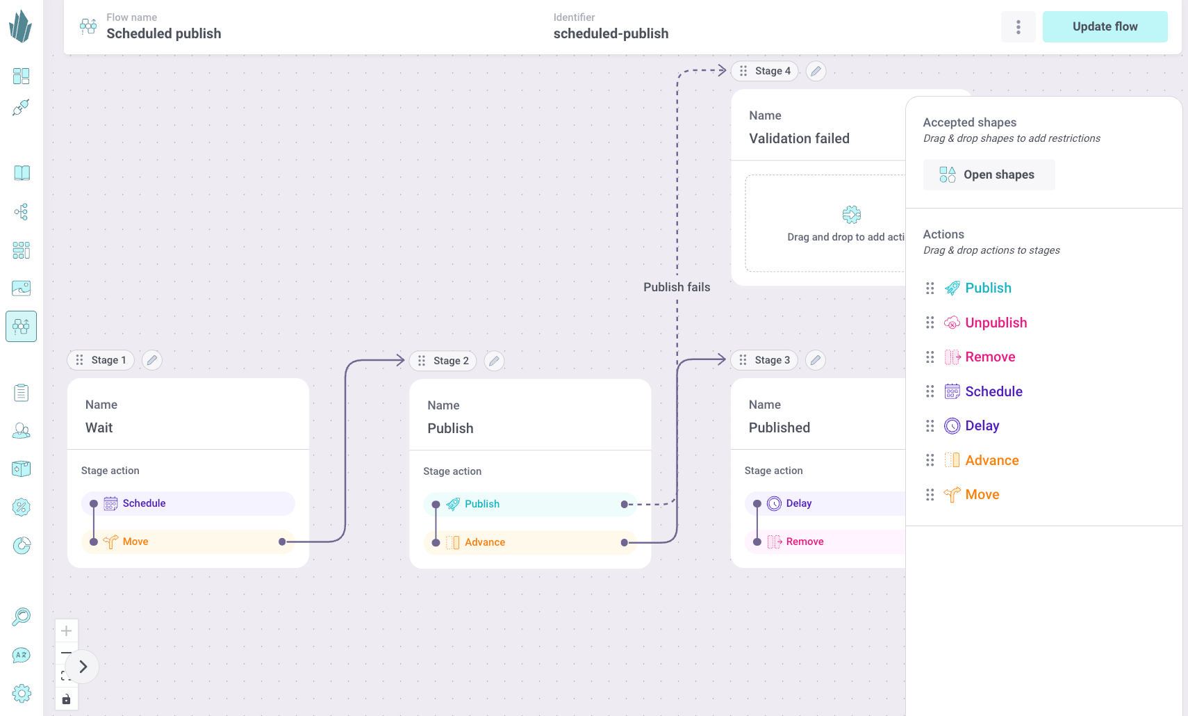 Flows let you model and manage structured workflows in Crystallize. They’re ideal for editorial processes, approval pipelines, publishing schedules, or any sequence of steps your team needs to follow.